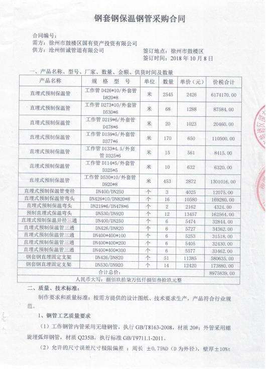 徐州市鼓樓區(qū)國有資產(chǎn)投資有限公司與我公司簽署鋼套鋼直埋保溫管供應(yīng)合同,滄州恒誠管道有限公司為當(dāng)?shù)責(zé)崃こ谈脑焯峁﹥?yōu)質(zhì)保溫管道,感謝貴單位對我公司的信賴與支持。